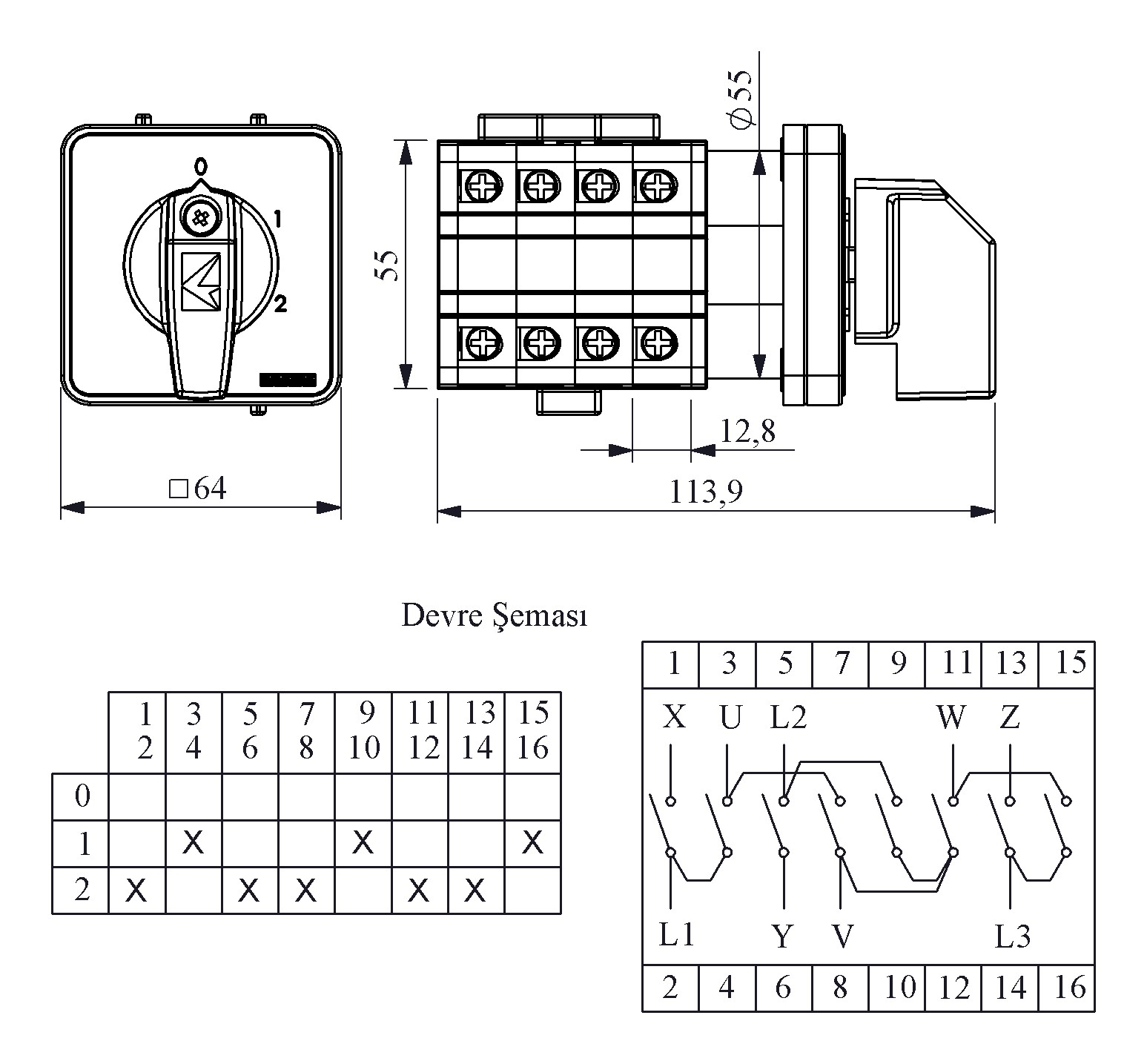 32A Çift Devir 3 Faz (0-1-2) 60° 64*64 Pako Şalter