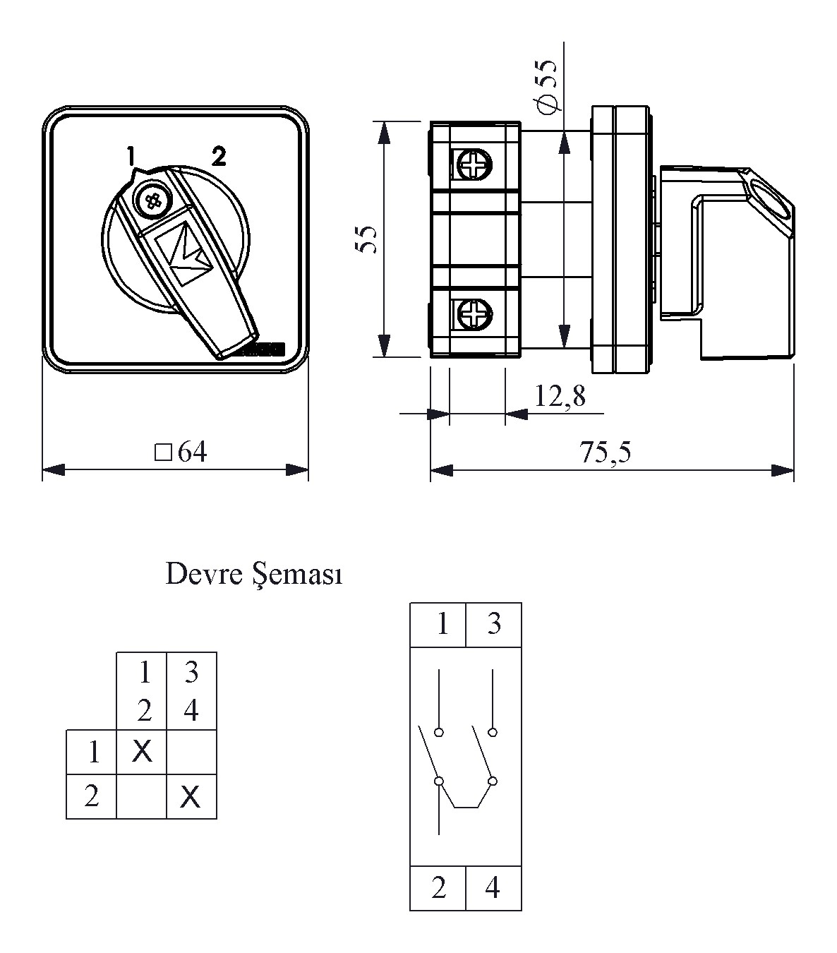 32A Kutup Değiştirici 1 Kutup (1-2) 60° 64*64 Pako Şalter