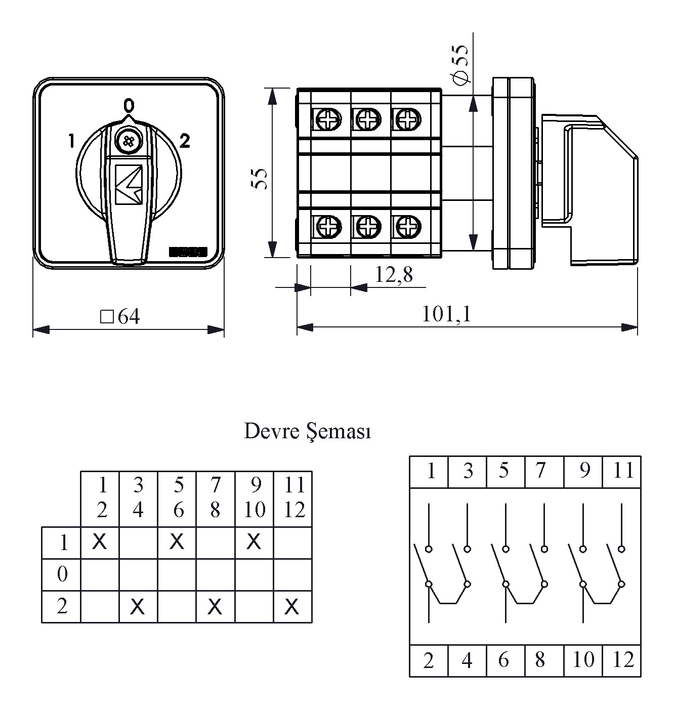 32A Kutup Değiştirici 3 Kutup (1-0-2) 60° 64*64 Pako Şalter