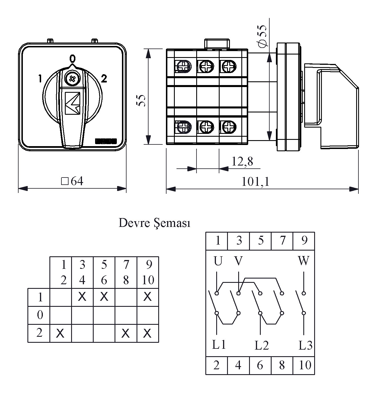 32A Enversör 3 Faz (1-0-2) 60° 64*64 Pako Şalter