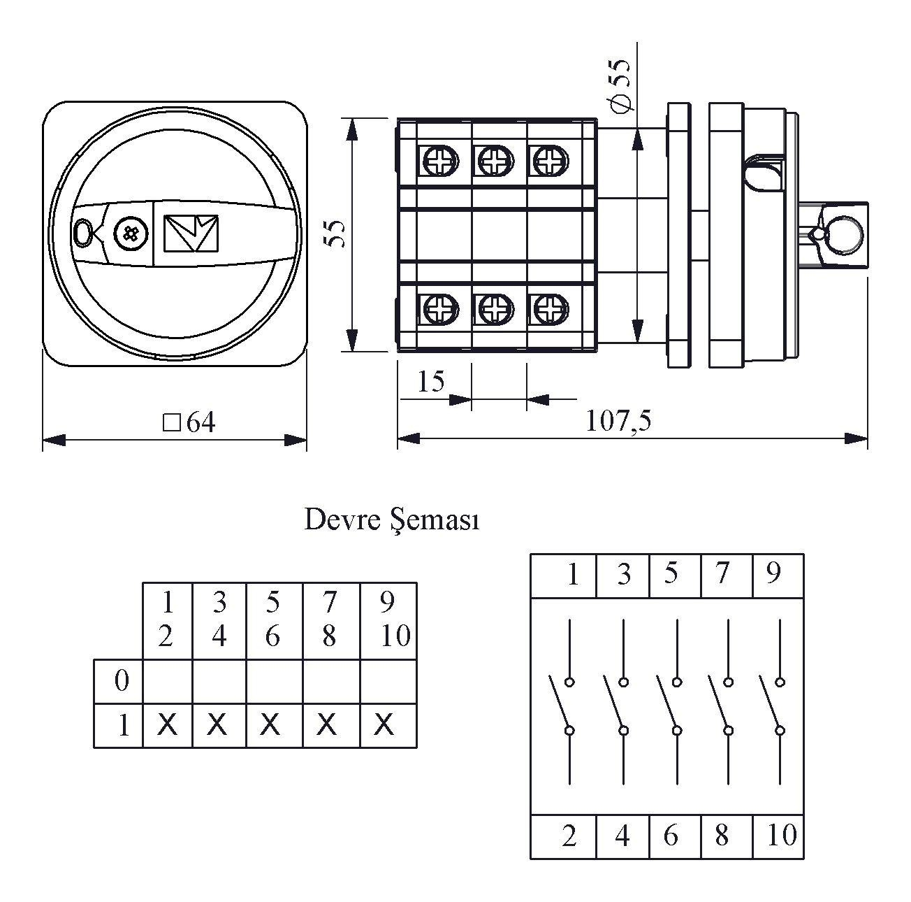 40A On-Off 5 Kutup (0-1) 90° Emniyet 64*64 Pako Şalter