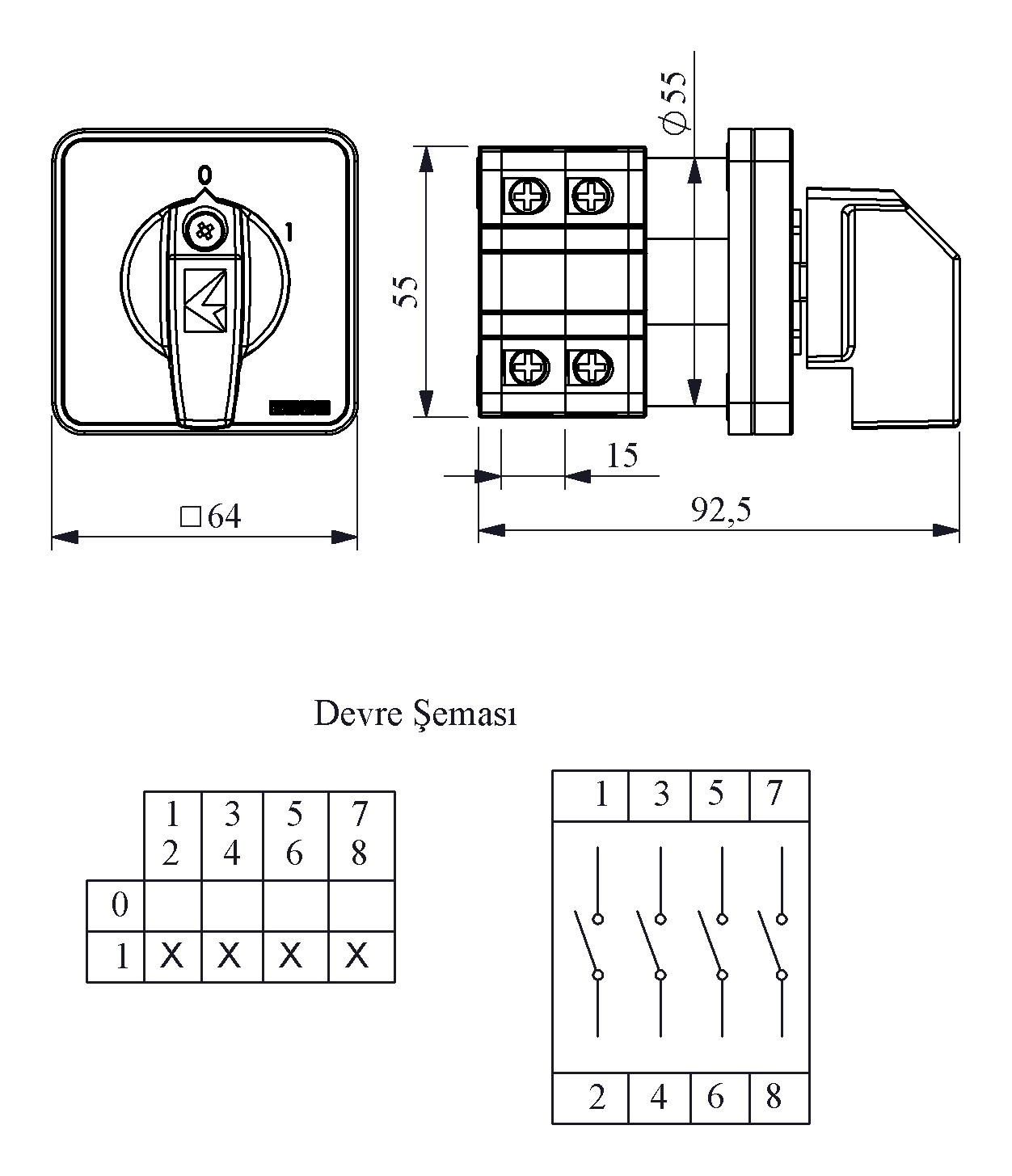 40A On-Off 3 Faz+Nötr (0-1) 60° 64*64 Pako Şalter