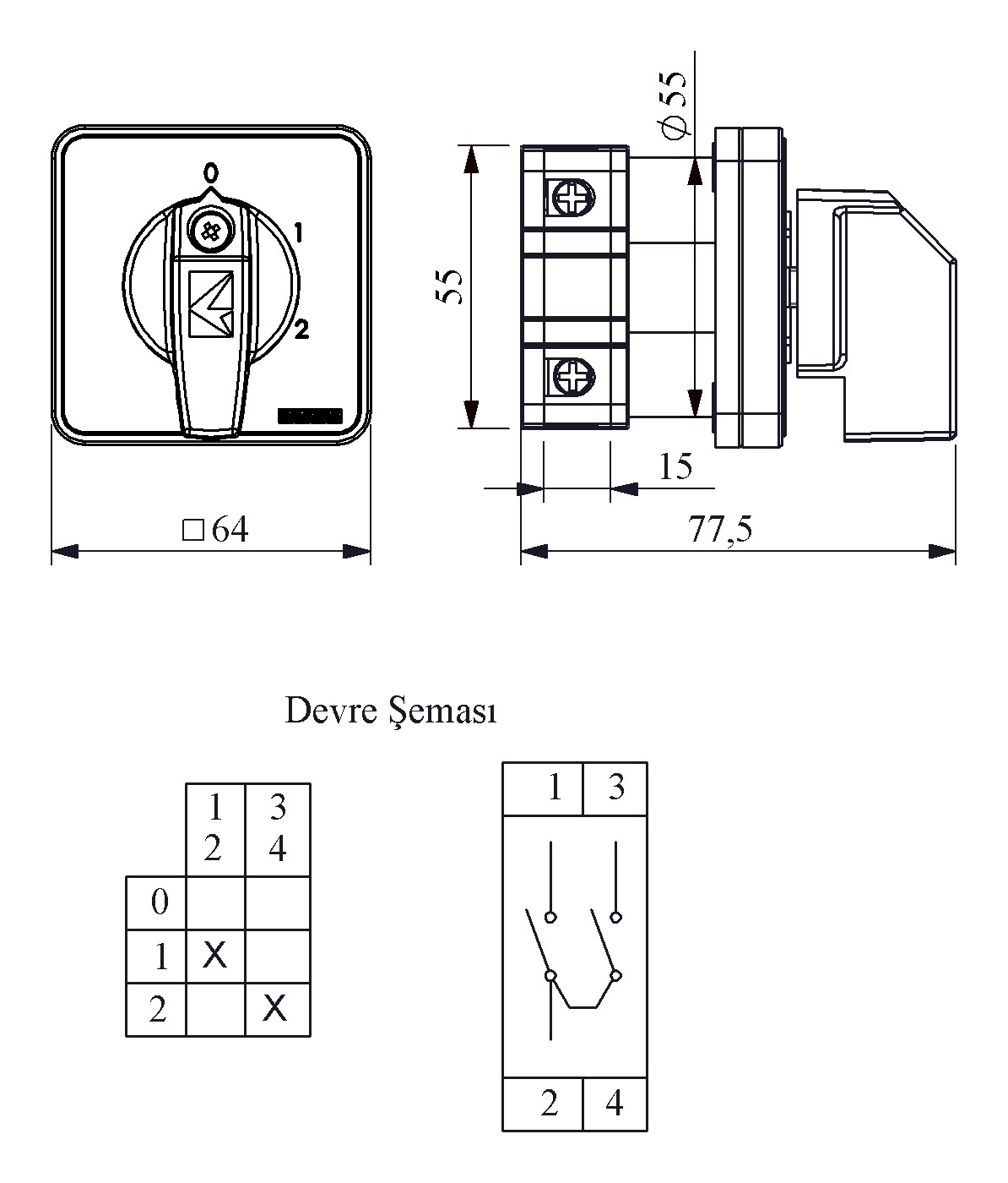 40A 2 Kademeli 1 Kutup (0-1-2) 60° 64*64 Pako Şalter