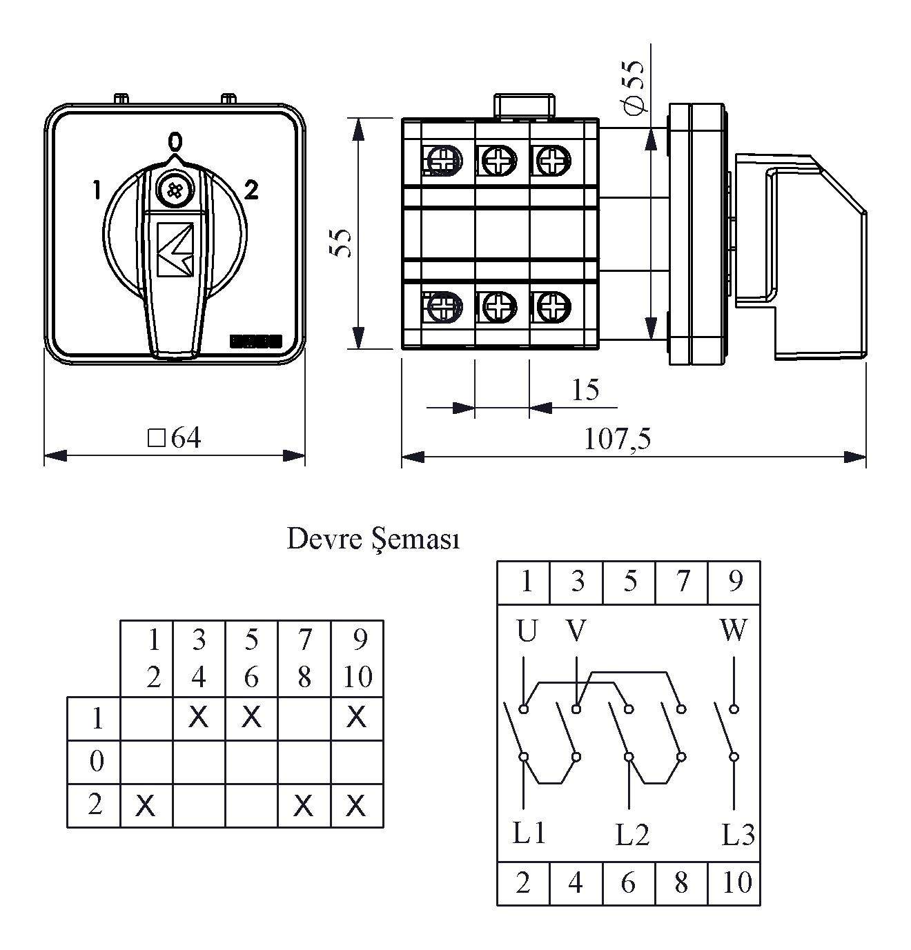 40A Enversör 3 Faz (1-0-2) 60° 64*64 Pako Şalter