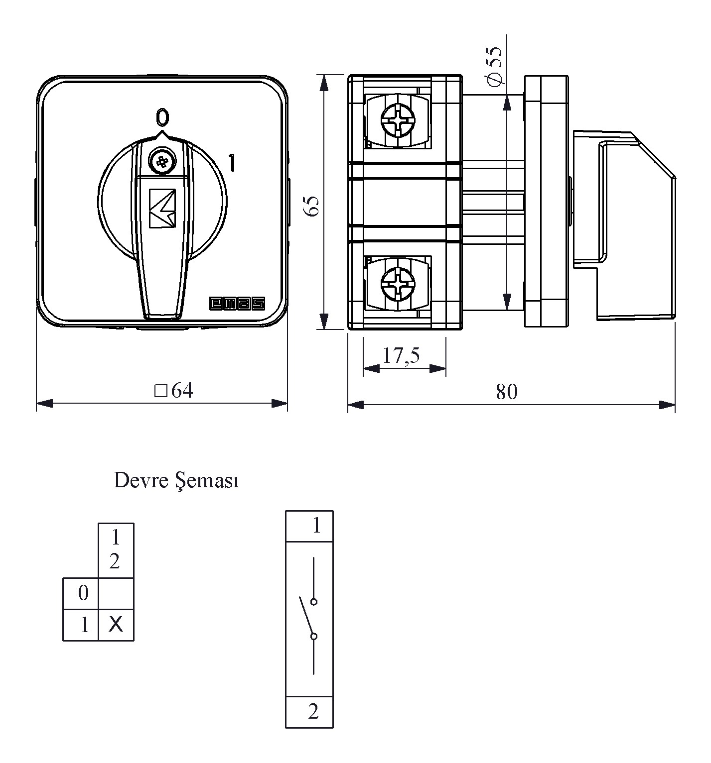 50A On-Off 1 Faz (0-1) 60° 64*64 Pako Şalter