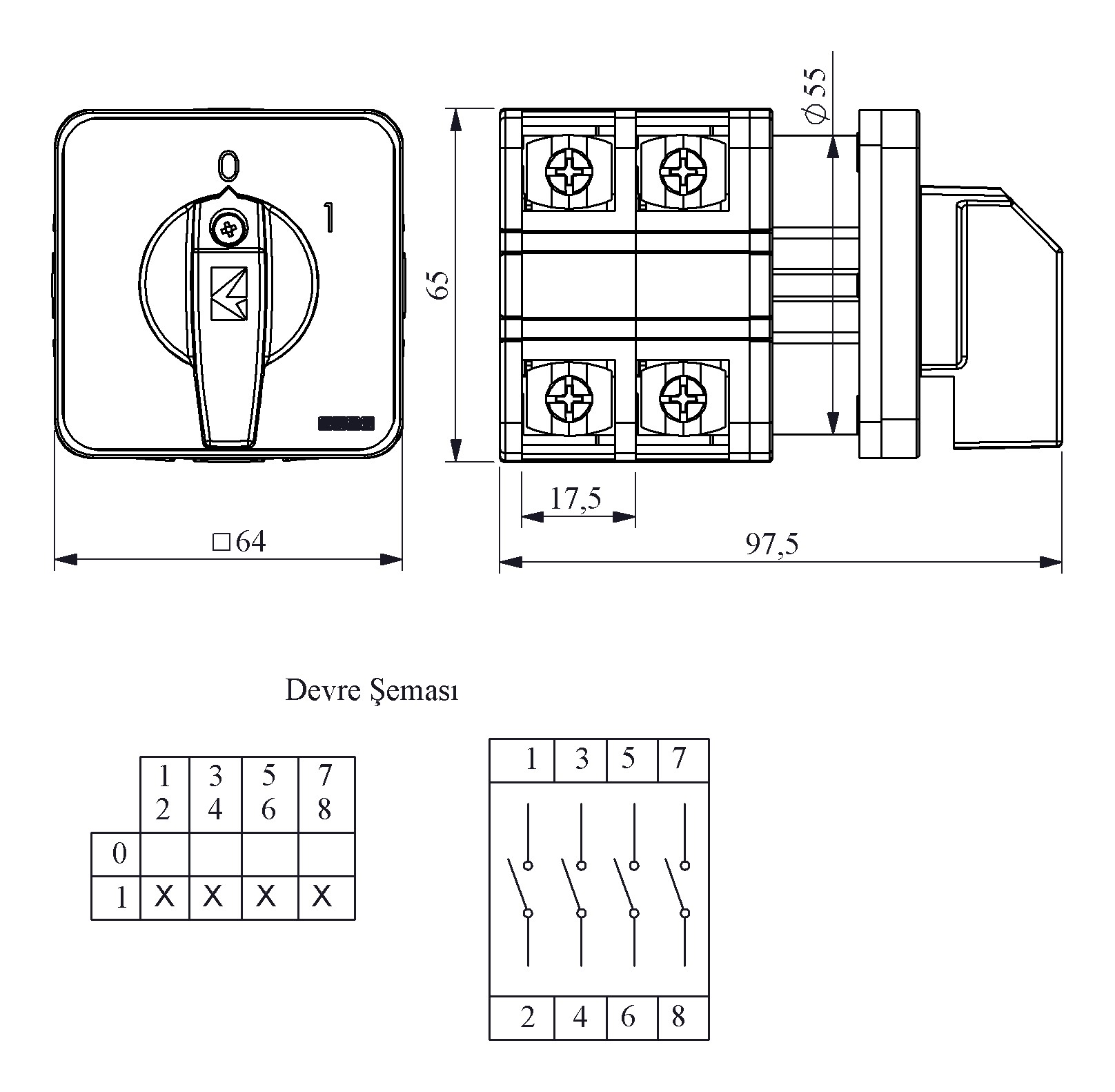 50A On-Off 3 Faz+Nötr (0-1) 60° 64*64 Pako Şalter