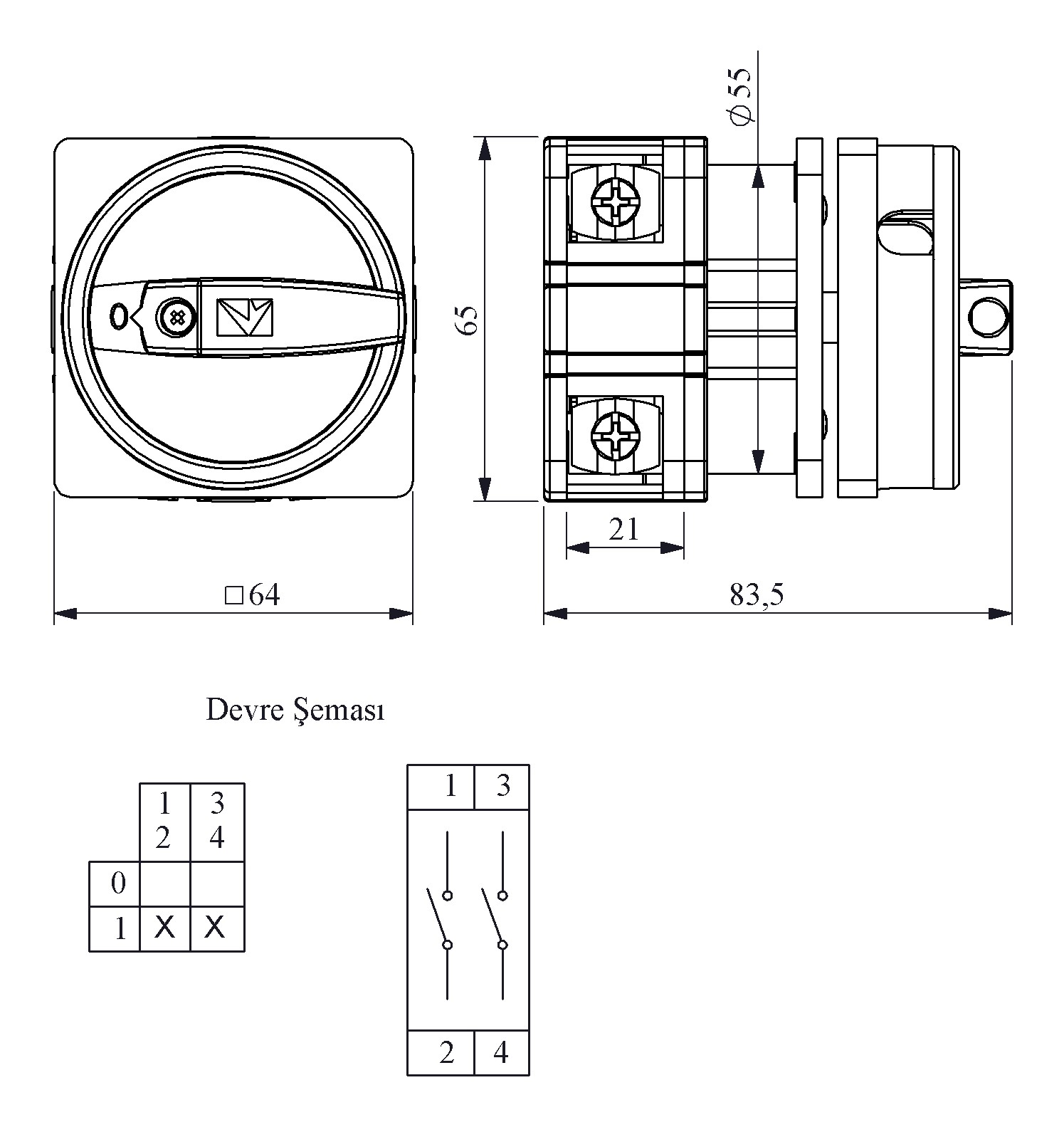 63A On-Off 2 Faz (0-1) 90° Emniyet 64*64 Pako Şalter