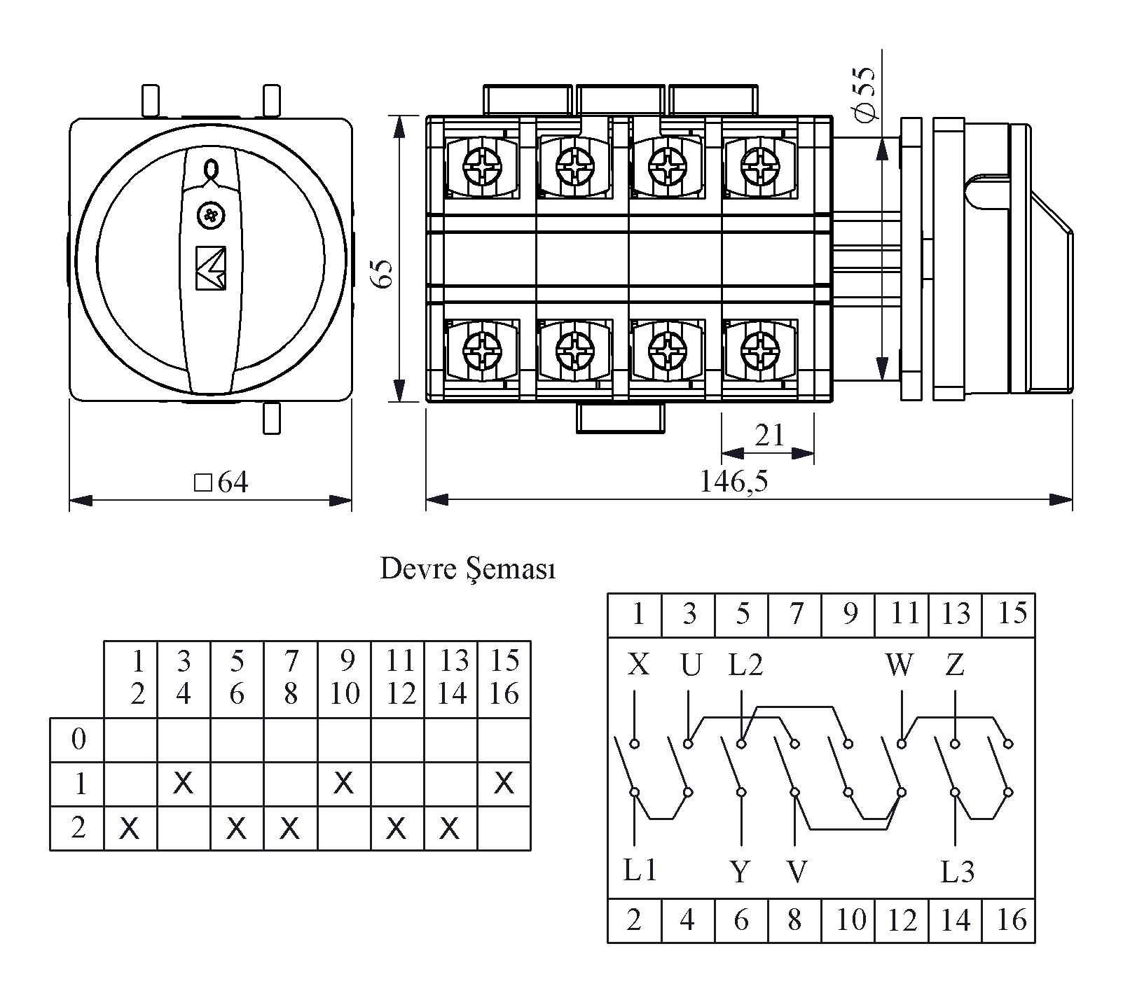 63A Çift Devir 3 Faz (0-1-2) 60° Emniyet 64*64 Pako Şalter