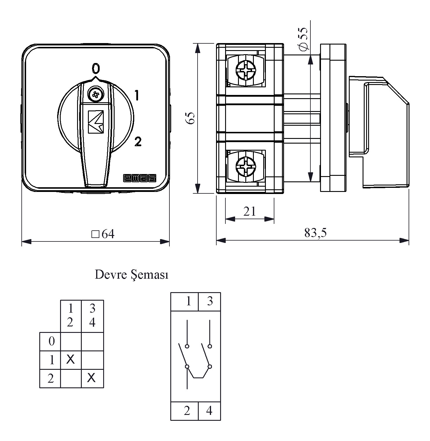 63A 2 Kademeli 1 Kutup (0-1-2) 60° 64*64 Pako Şalter