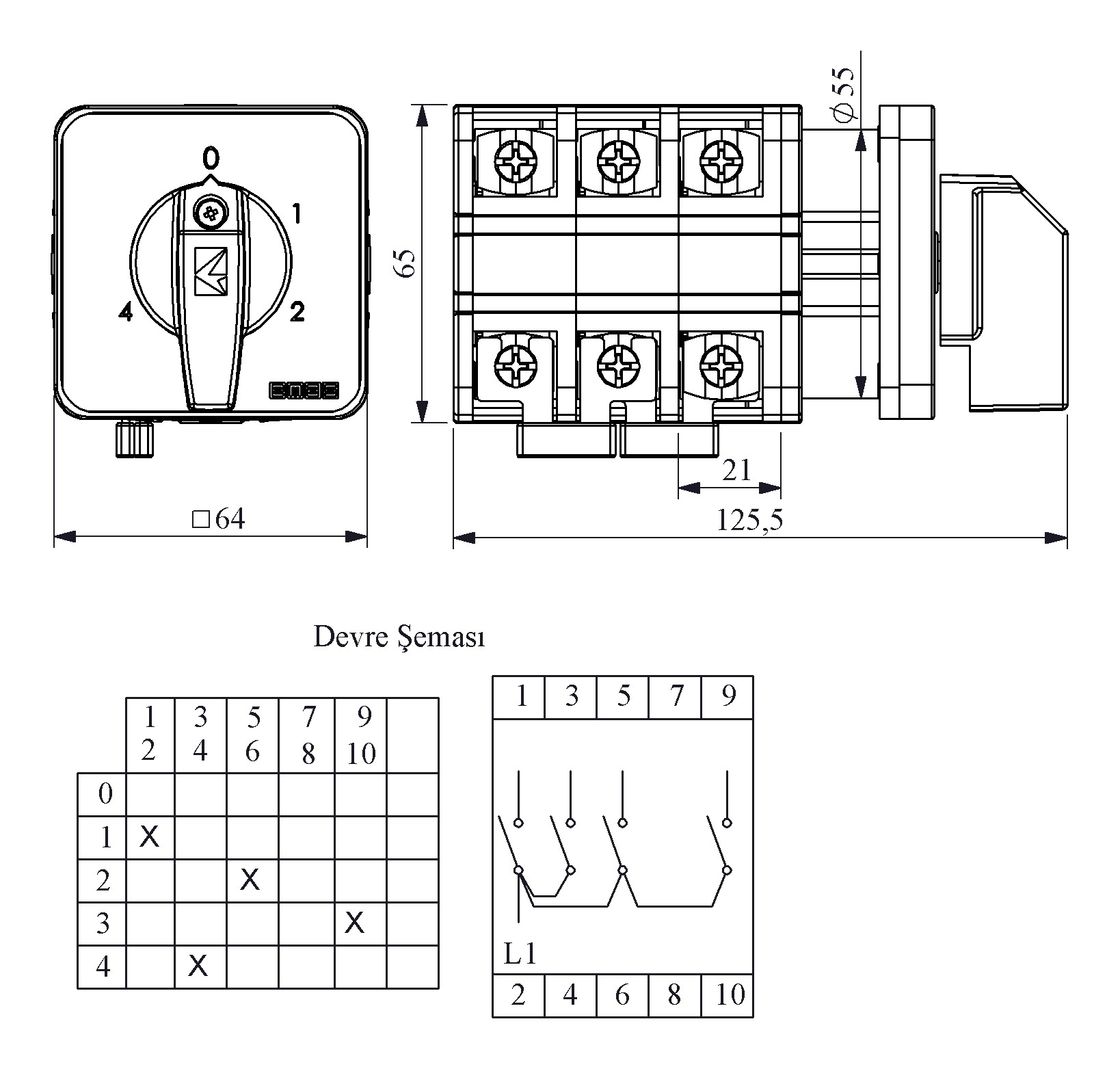 63A 4 Kademeli 1 Kutup (0-4) 60° 64*64 Pako Şalter