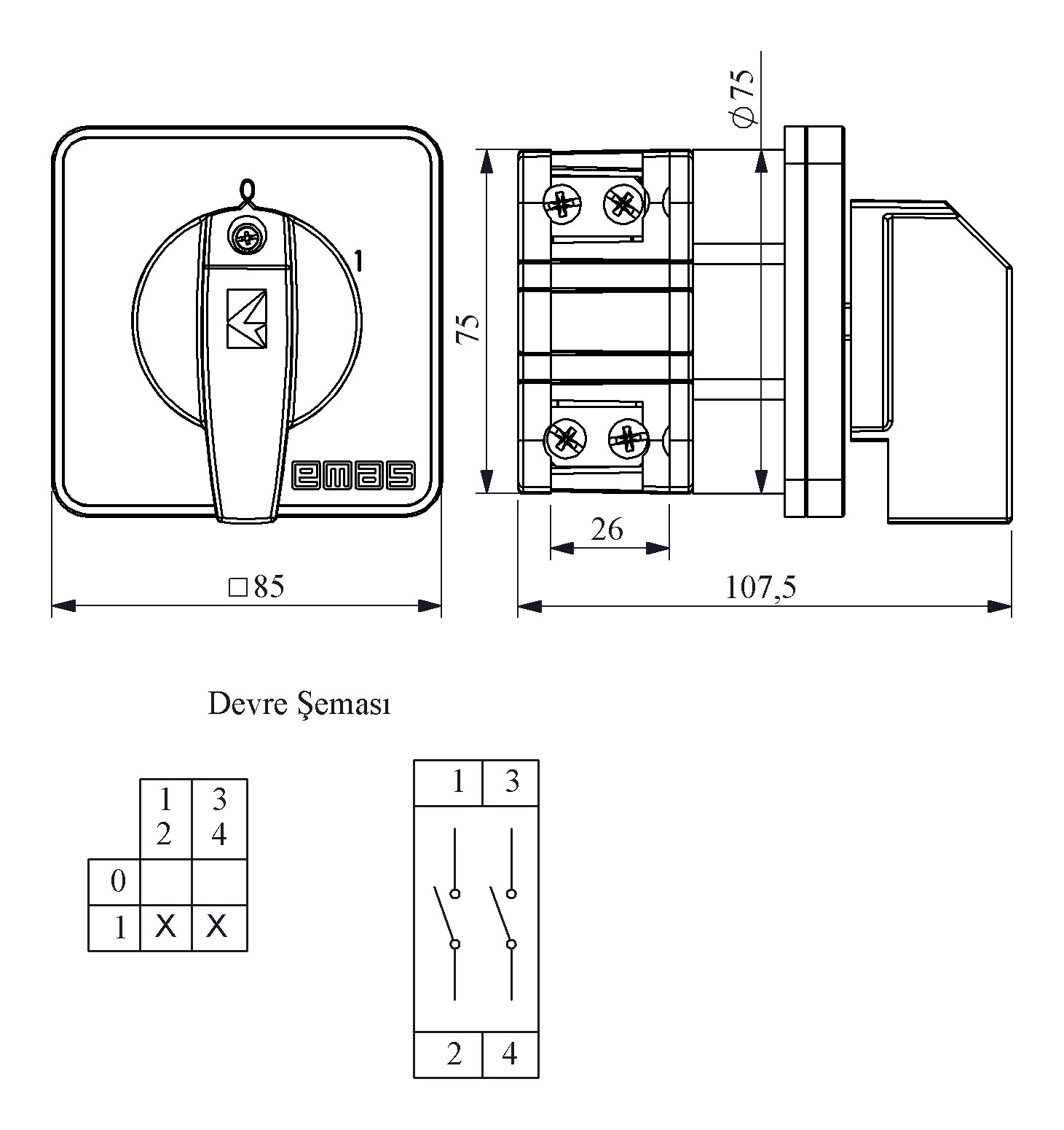 80A On-Off 2 Faz (0-1) 60° 85*85 Pako Şalter