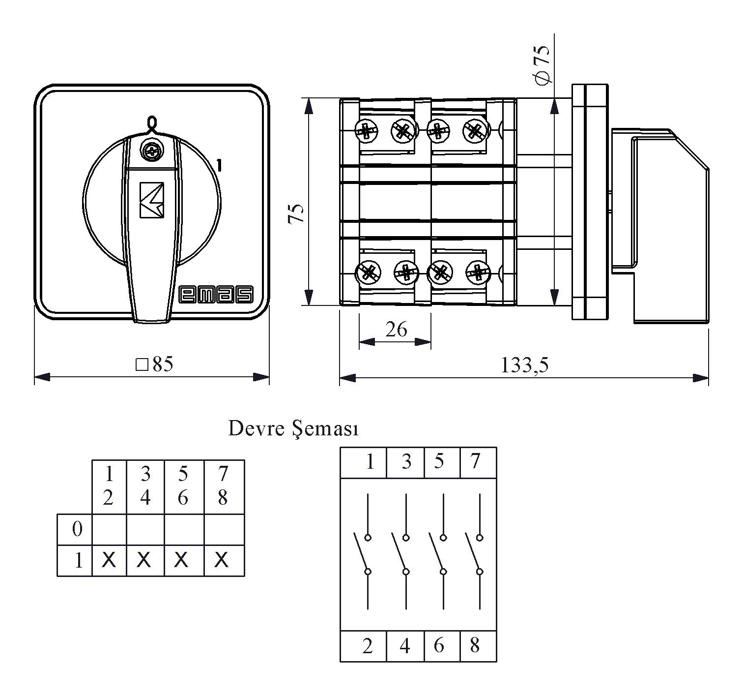 80A On-Off 3 Faz+Nötr (0-1) 60° 85*85 Pako Şalter