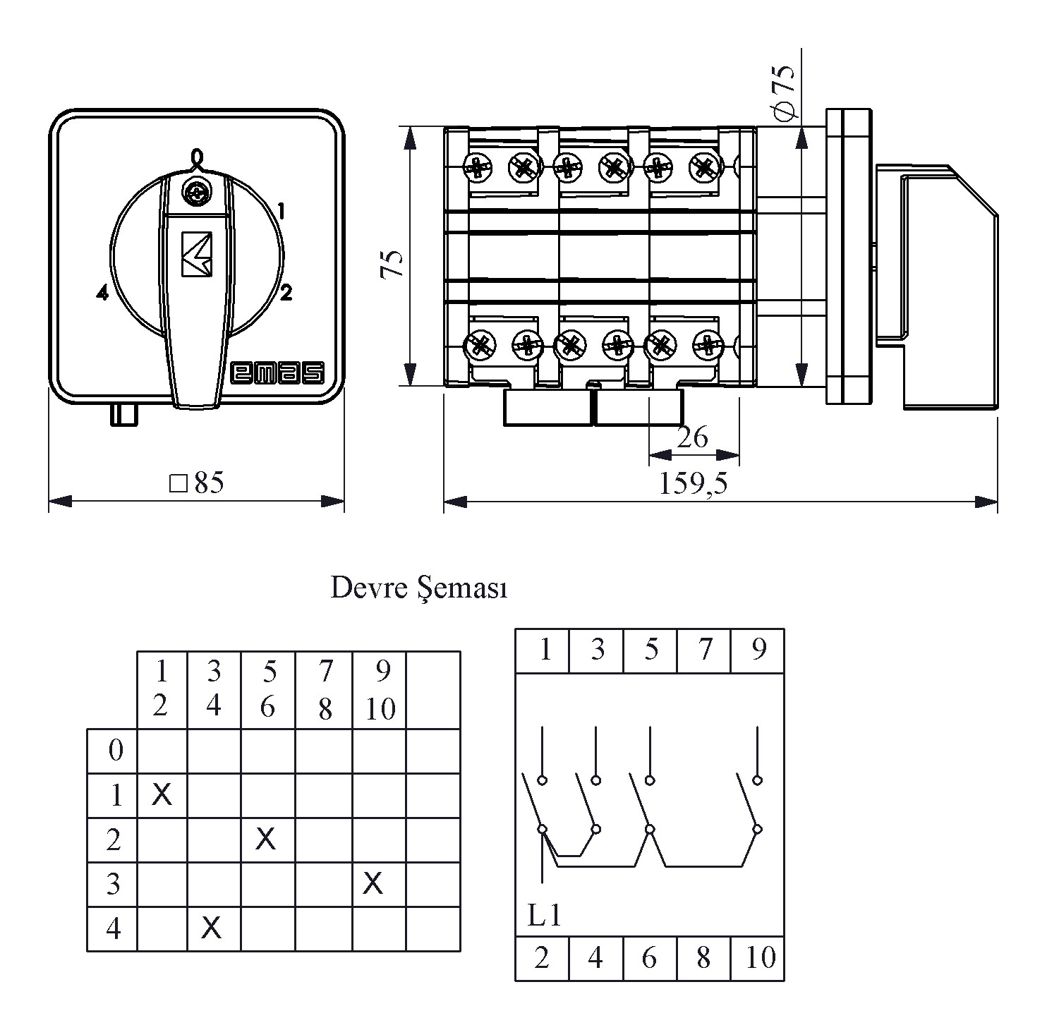 80A 4 Kademeli 1 Kutup (0-4) 60° 85*85 Pako Şalter