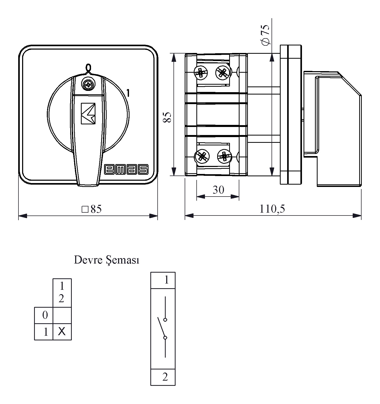 120A On-Off 1 Faz (0-1) 60° 85*85 Pako Şalter