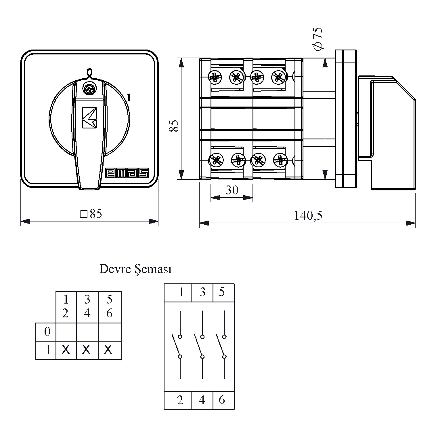 120A On-Off 3 Faz (0-1) 60° 85*85 Pako Şalter