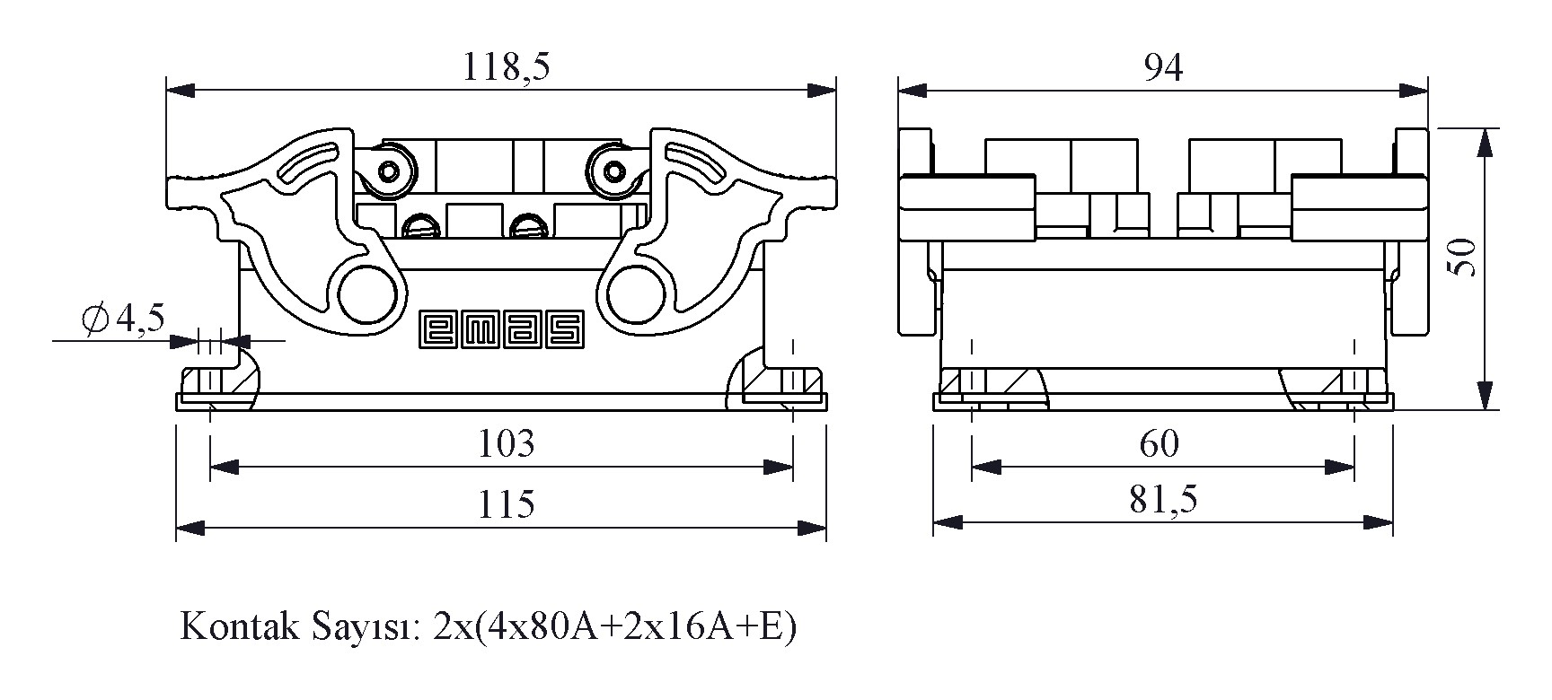 Metal 12 Kontak Makine Tipi Priz 2*((4x80A)+(2x16A)) Alttan Girişli 4 Mandallı Çok Kontaklı