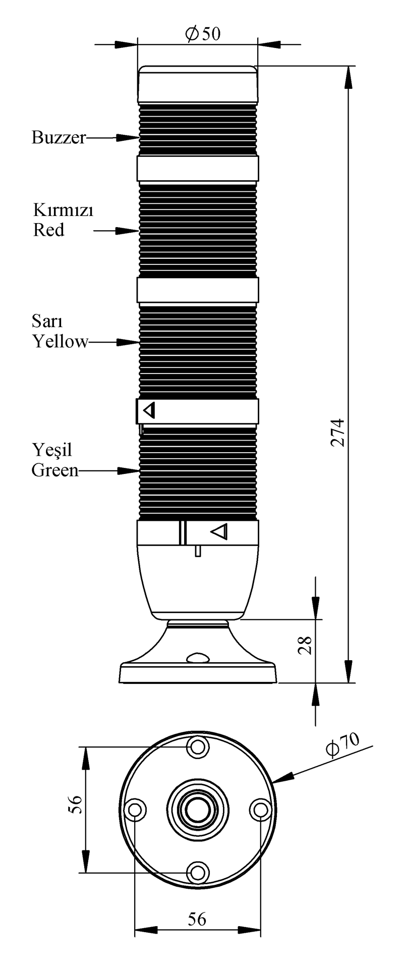 IK Serisi Dört Katlı 24V AC/DC Buzzerlı 45mm Borulu Plastik Ayaklı LED Kolon 50mm