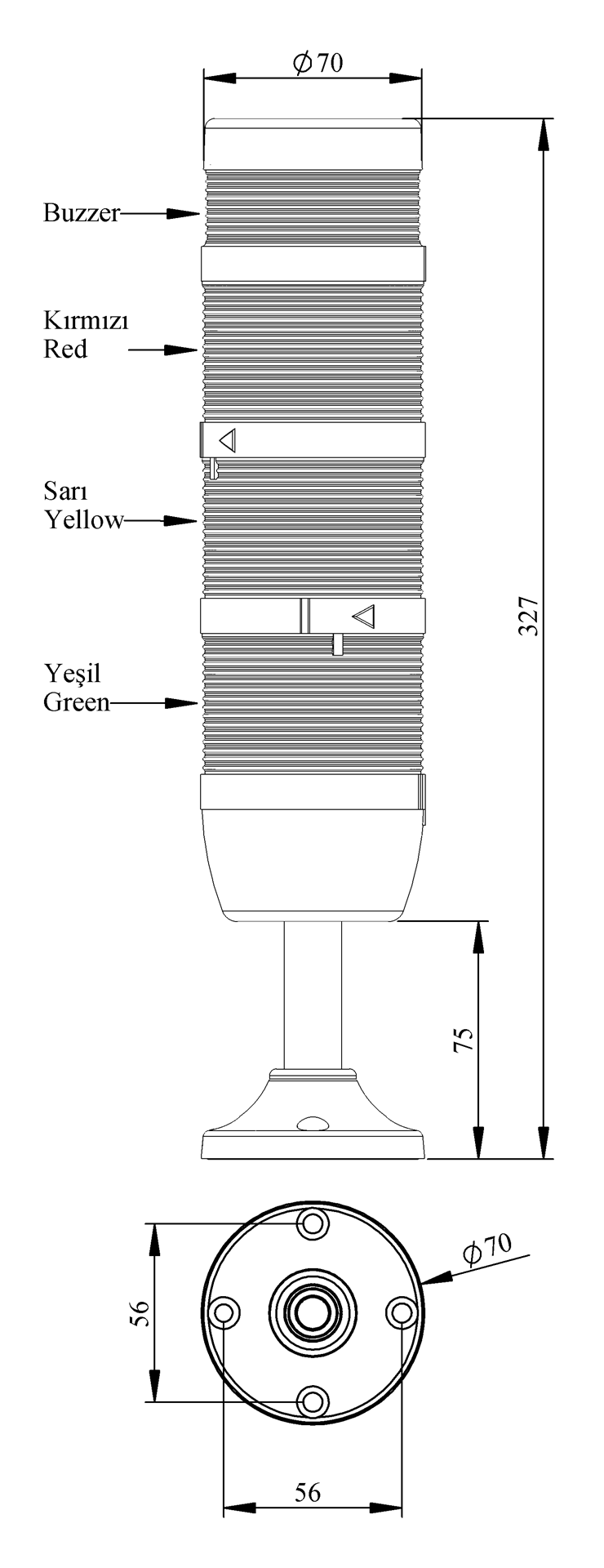 IK Serisi Dört Katlı 24V AC/DC Buzzerlı 100mm Borulu Plastik Ayaklı LED Kolon 70mm