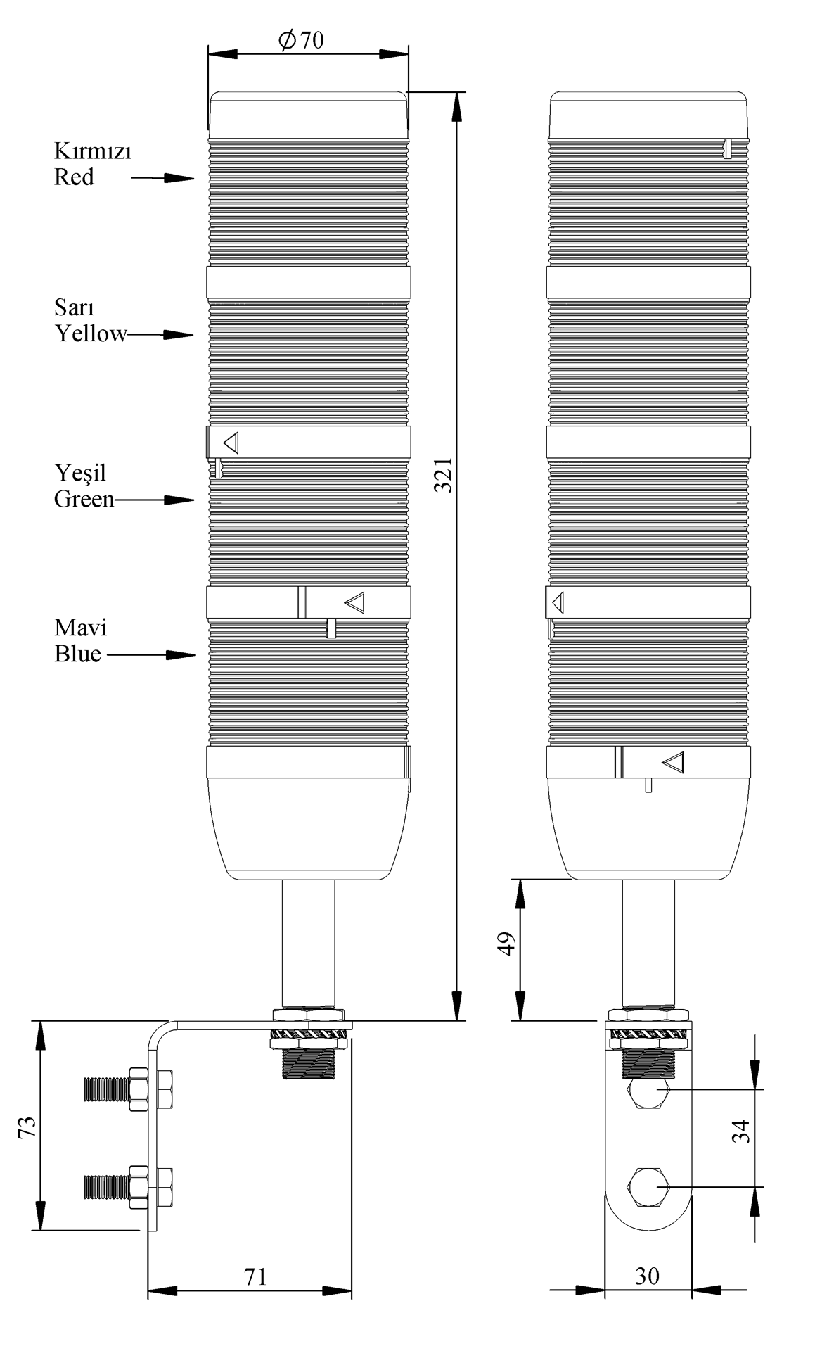 IK Serisi Dört Katlı 24V AC/DC Flaşör Duvar (L) Etanjlı Ayaklı LED Kolon 70mm