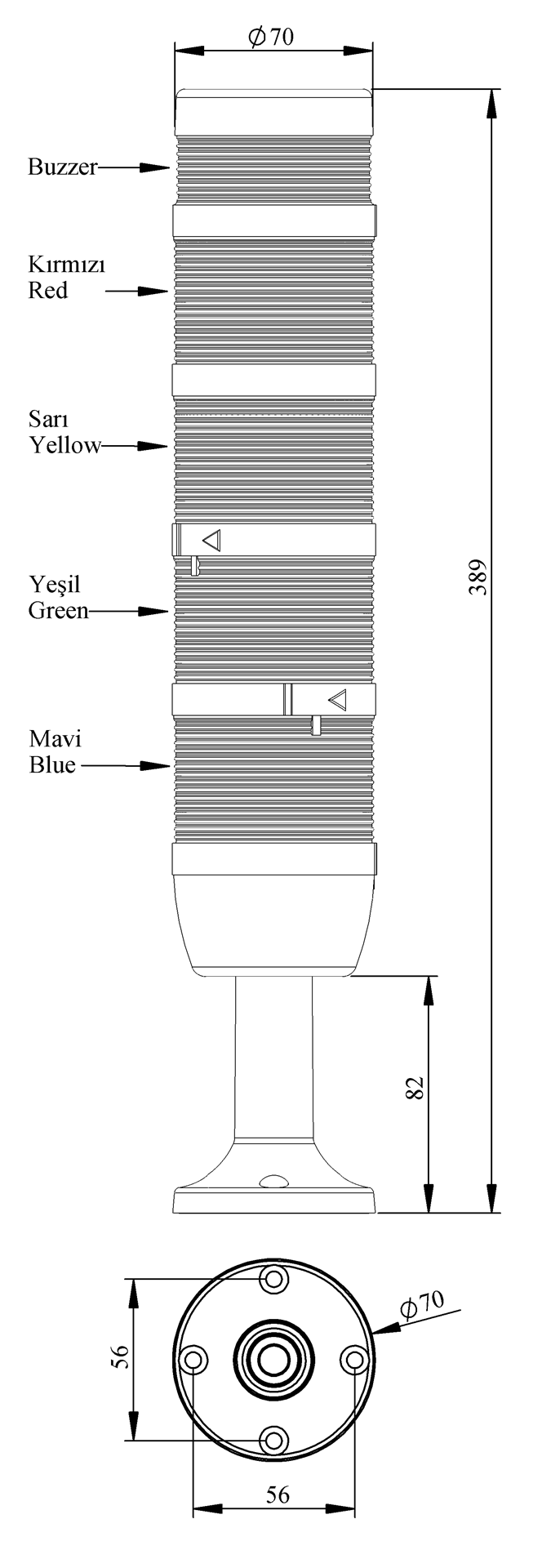 IK Serisi Beş Katlı 220V AC Buzzerlı 110mm Plastik Boru ve Ayaklı LED Kolon 70mm