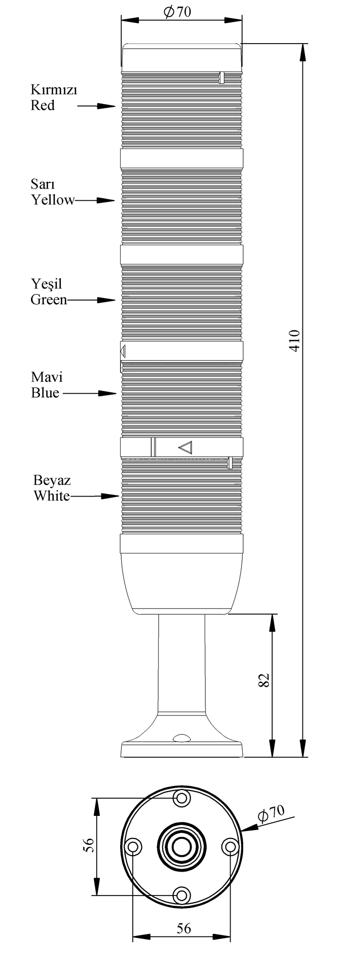 IK Serisi Beş Katlı 24V AC/DC Flaşör 110mm Plastik Boru ve Ayaklı LED Kolon 70mm