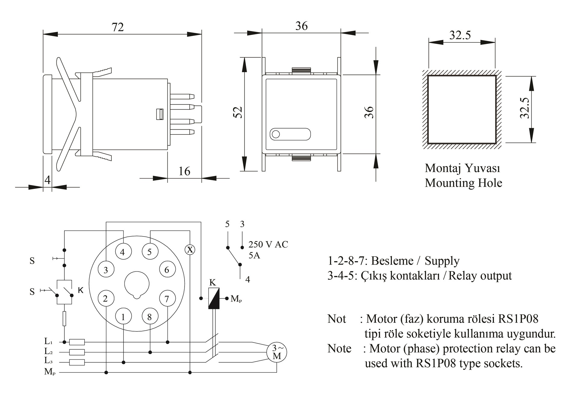 RAM Serisi 8 Pin'li 3x380VAC 1CO 5A (rezistif) Analog Motor Koruma Elektronik Röle