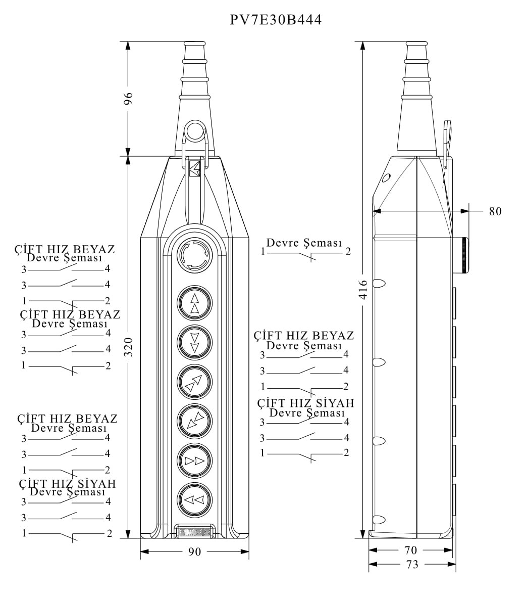 PV Serisi 7 Gözlü Çift Hızlı 1NC Acil Stoplu Vinç Kumanda Kutusu