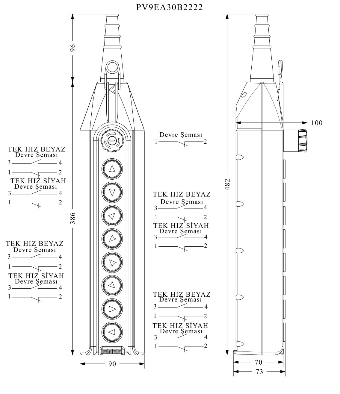 PV Serisi 9 Gözlü Tek Hızlı 1NC Acil Stoplu Çevirmeli Anahtarlı Vinç Kumanda Kutusu